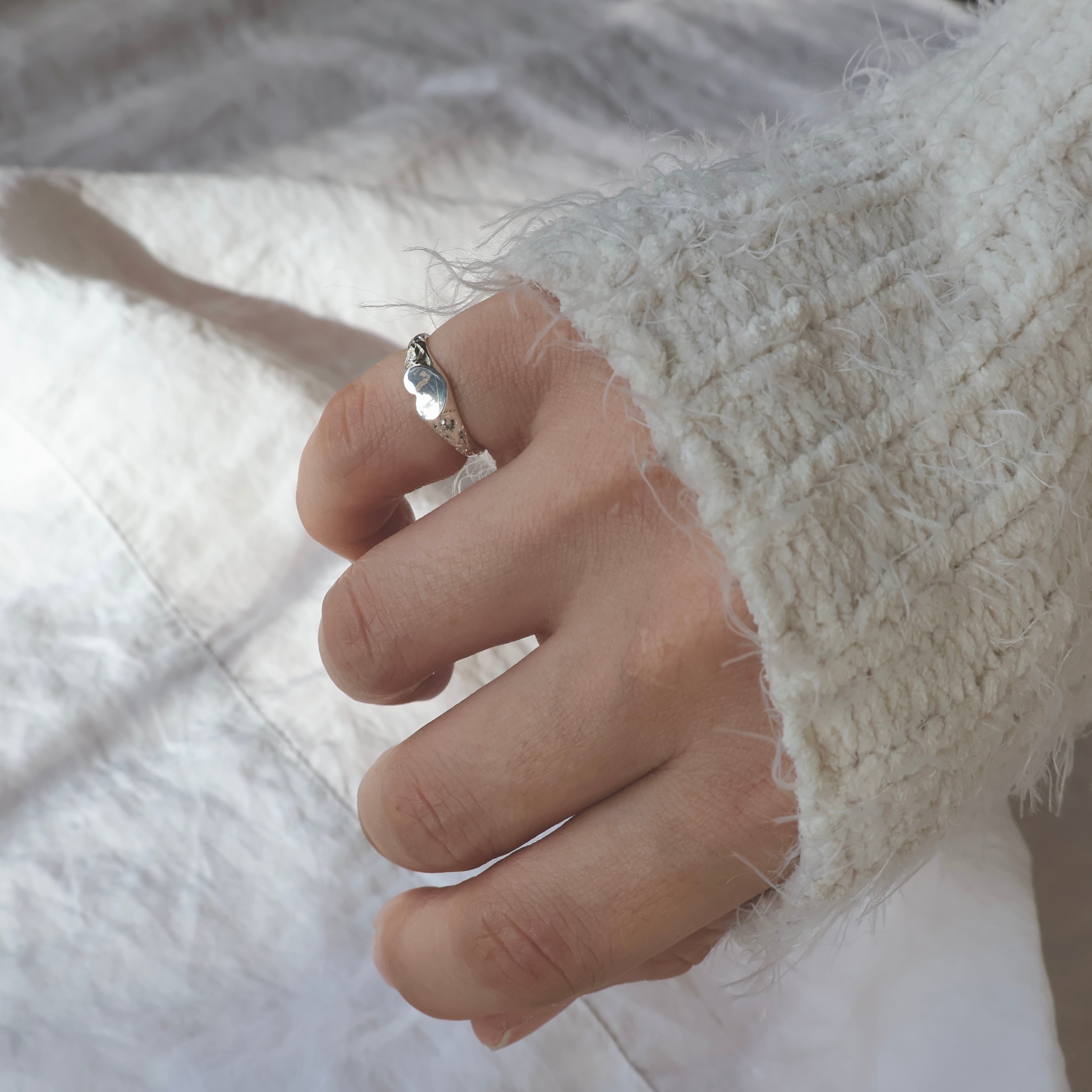 指先にさりげない個性を添える、華奢なハートのシグネットリング。